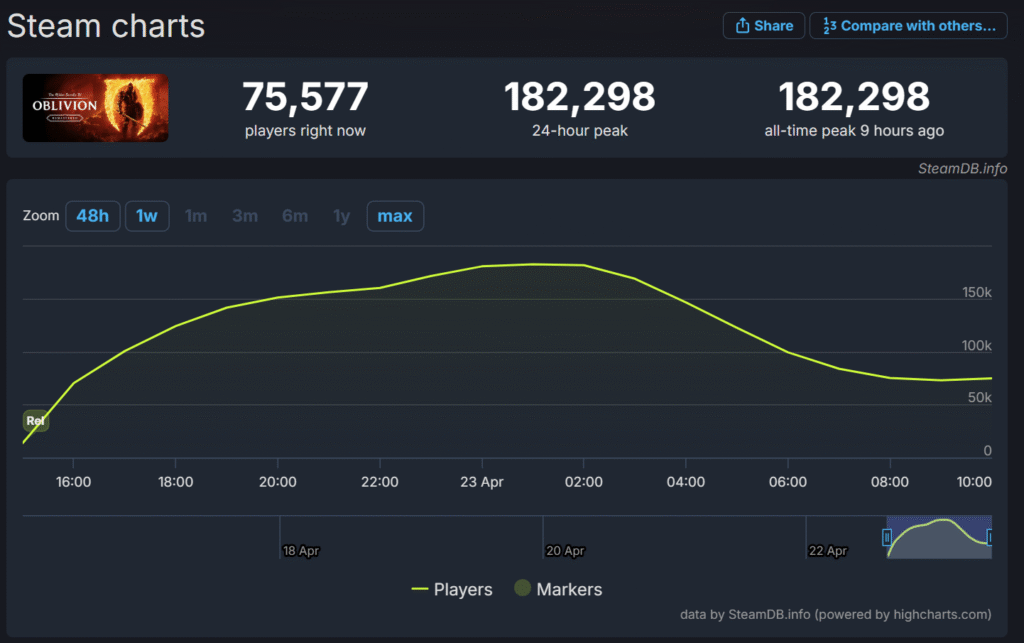On April 21st, 2025 after a leaked surprise announcement The Elder Scrolls IV, Oblivion Remaster was both announced and immediately released directly after the announcement, this led to an internet sensation among fans of the franchise and everyday gamers alike, within the next day over 180,000 people were seen playing the game on steam alone.